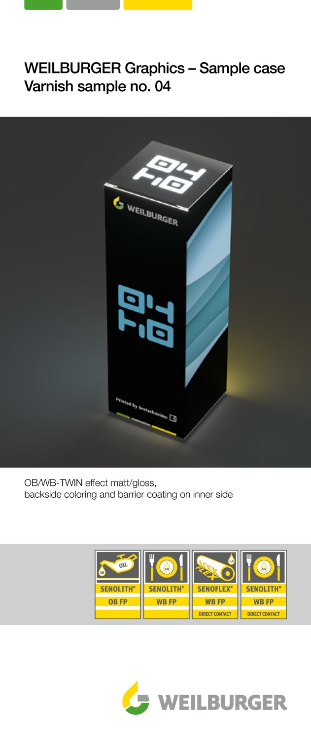 This combination is of course only suitable for printing systems with UV equipment. But here, too, the oil-based varnish component is the main problem and even with this combination, severe yellowing due to the oil-based varnish is to be expected. So for this combination, too, the advice is to use this varnish effect only on dark to black areas of the print image. However, with this combination, if applied correctly, the varnish effect is more pronounced both visually and tactilely. However, because of the UV lacquer used, the usual problems associated with UV printing, such as breakage and flaking of the lacquer during cutting, die-cutting, folding, creasing, stitching, etc., must be expected during finishing, especially if the lacquer is applied at the edges. For this reason we recommend using a coating plate also for commercial printing and omitting the UV lacquer in all vulnerable areas. This increases production costs, but in the end, it saves waste and complaints in most cases. An exemplary coating system here is SENOLITH® OB EFFECT MATT VARNISH HYBRID FP 355424 with the embossable SENOLITH® UV GLOSS LACQUER INLINE STAMPABLE FP PLUS 360435 from WEILBURGER Graphics. The enormous advantages of embossable coatings will be explained in detail later.